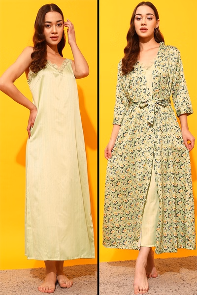 Be the first to review “2 Pc Set in Mint Green – Long Night Dress & Floral Print Robe – Satin” Cancel reply