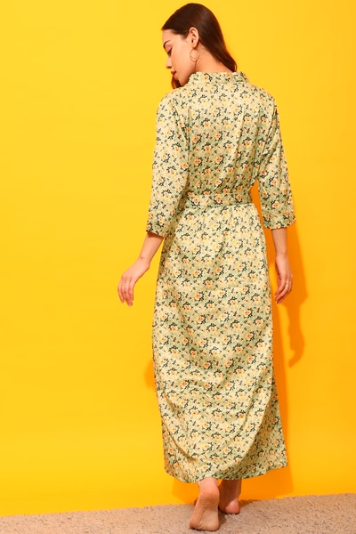 - It is paired with a floral print robe that exudes sophistication