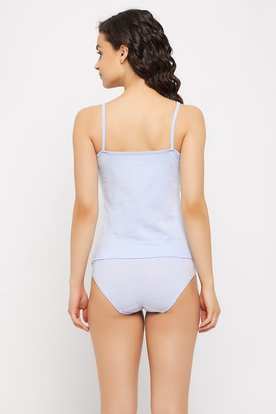 Powder blue camisole & low waist bikini panty crafted with breathable & stretchable cotton spandex fabric.