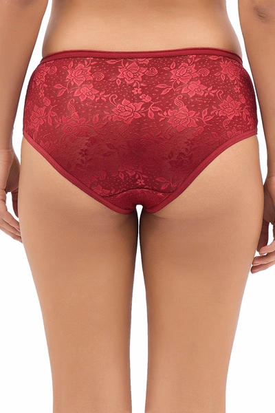 This maroon mid waist hipster panty is crafted with exquisite lace fabric. It offers medium rear coverage and has a double-layered gusset for hygiene. It is designed with soft elastic on the waist and leg openings for a comfortable and snug fit.